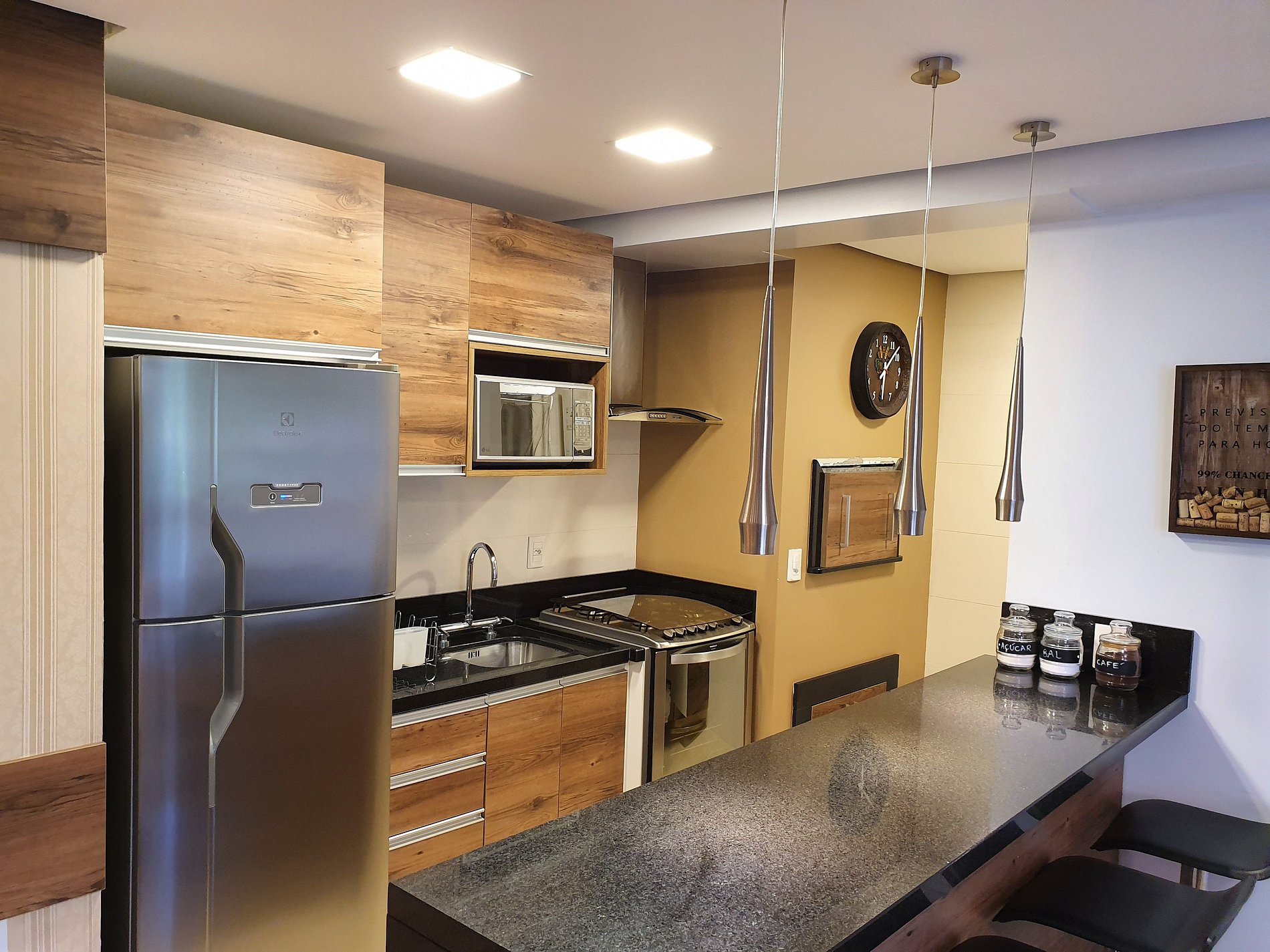 Cozinha totalmente equipada para refeições rápidas ou refeições completas. Inclui: geladeira, fogão embutido, micro-ondas, cafeteira, sanduicheira, chaleira, todos os utensílios de cozinha (copos, canecas, facas, taças, talheres, panelas, liquidificador, frigideiras etc.).