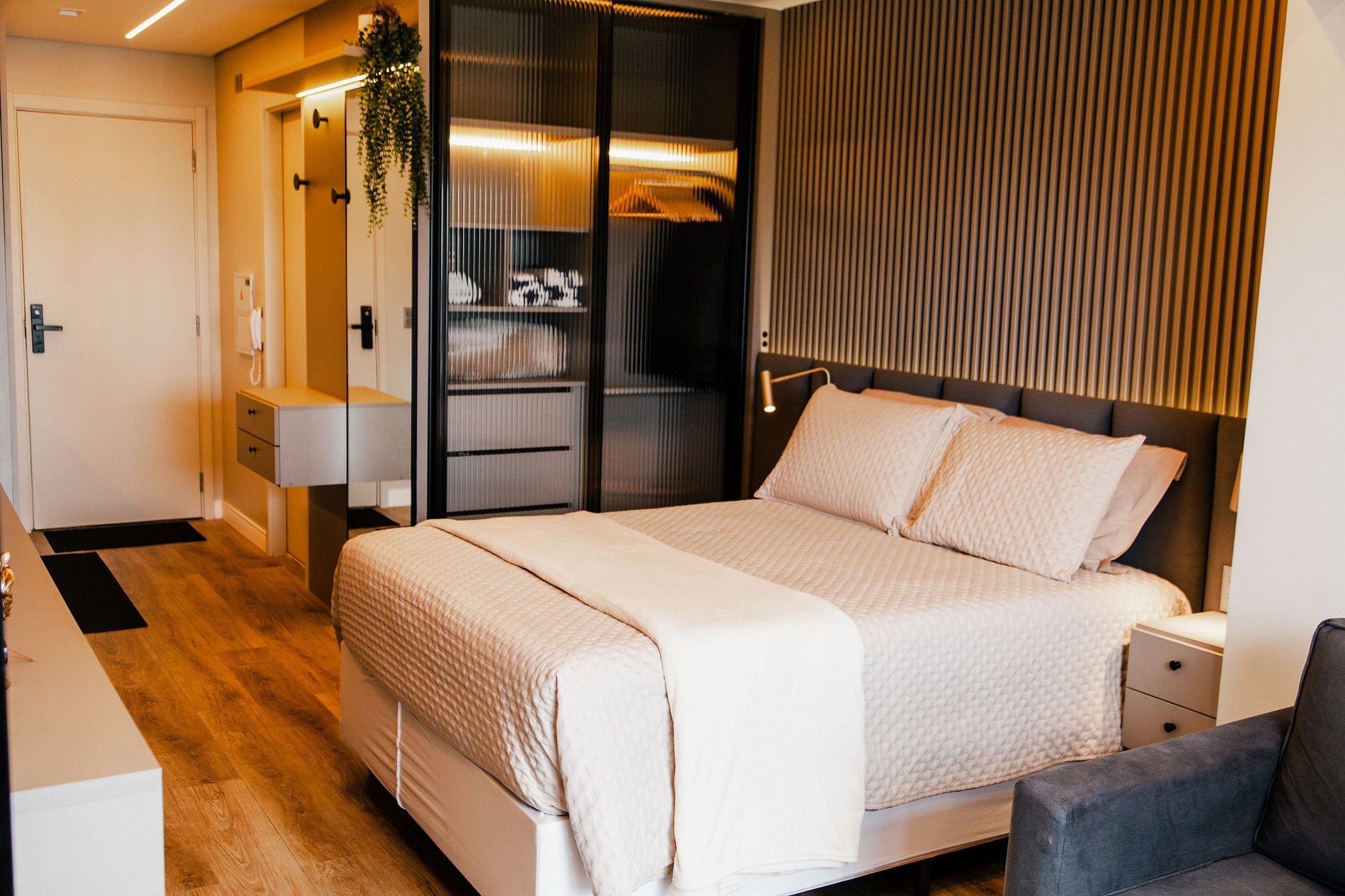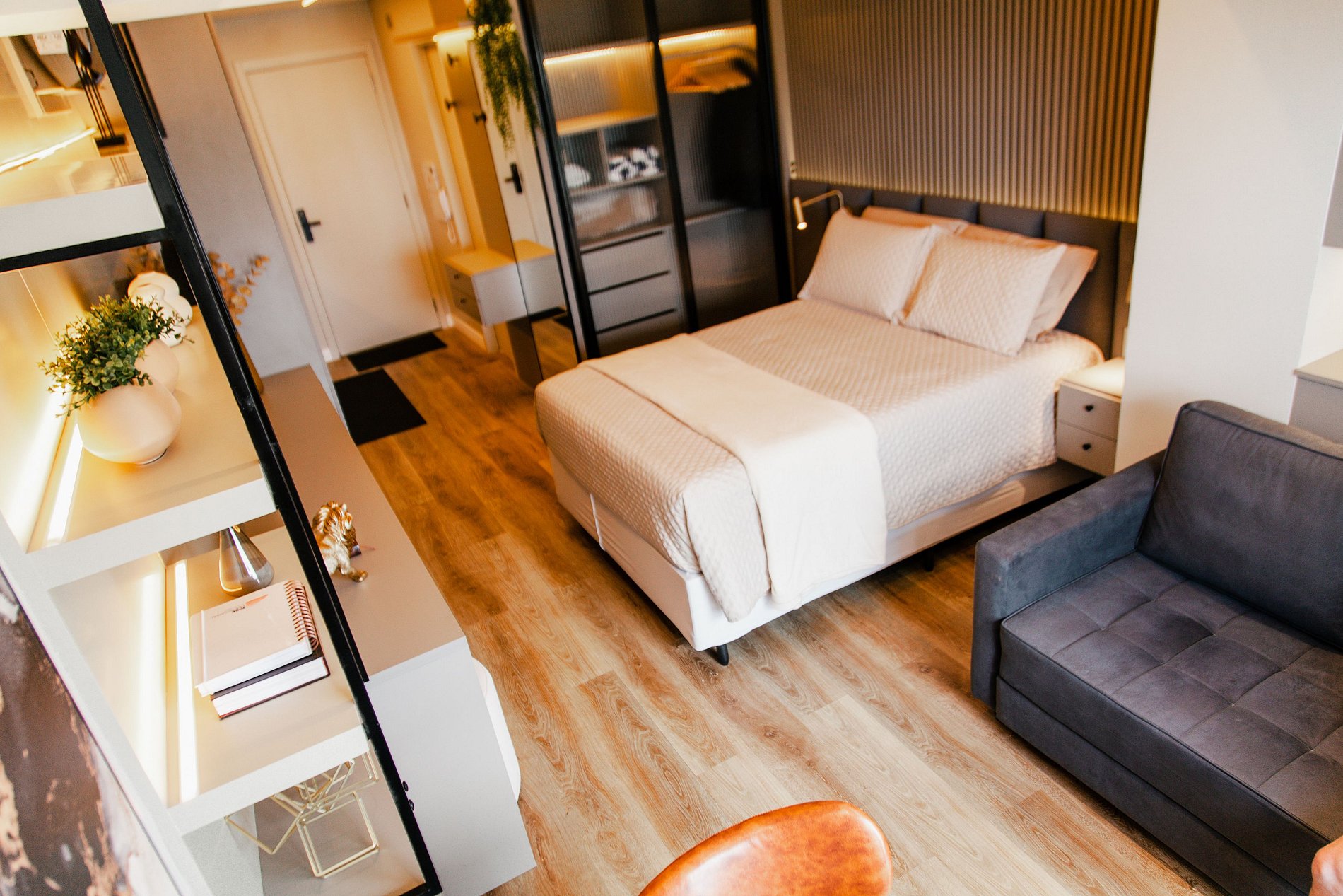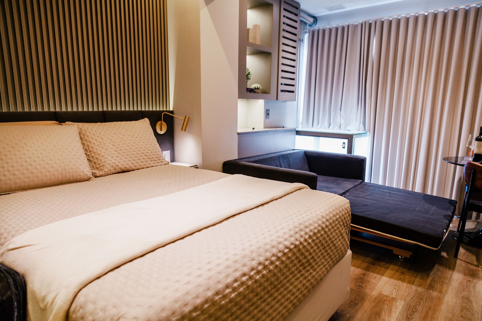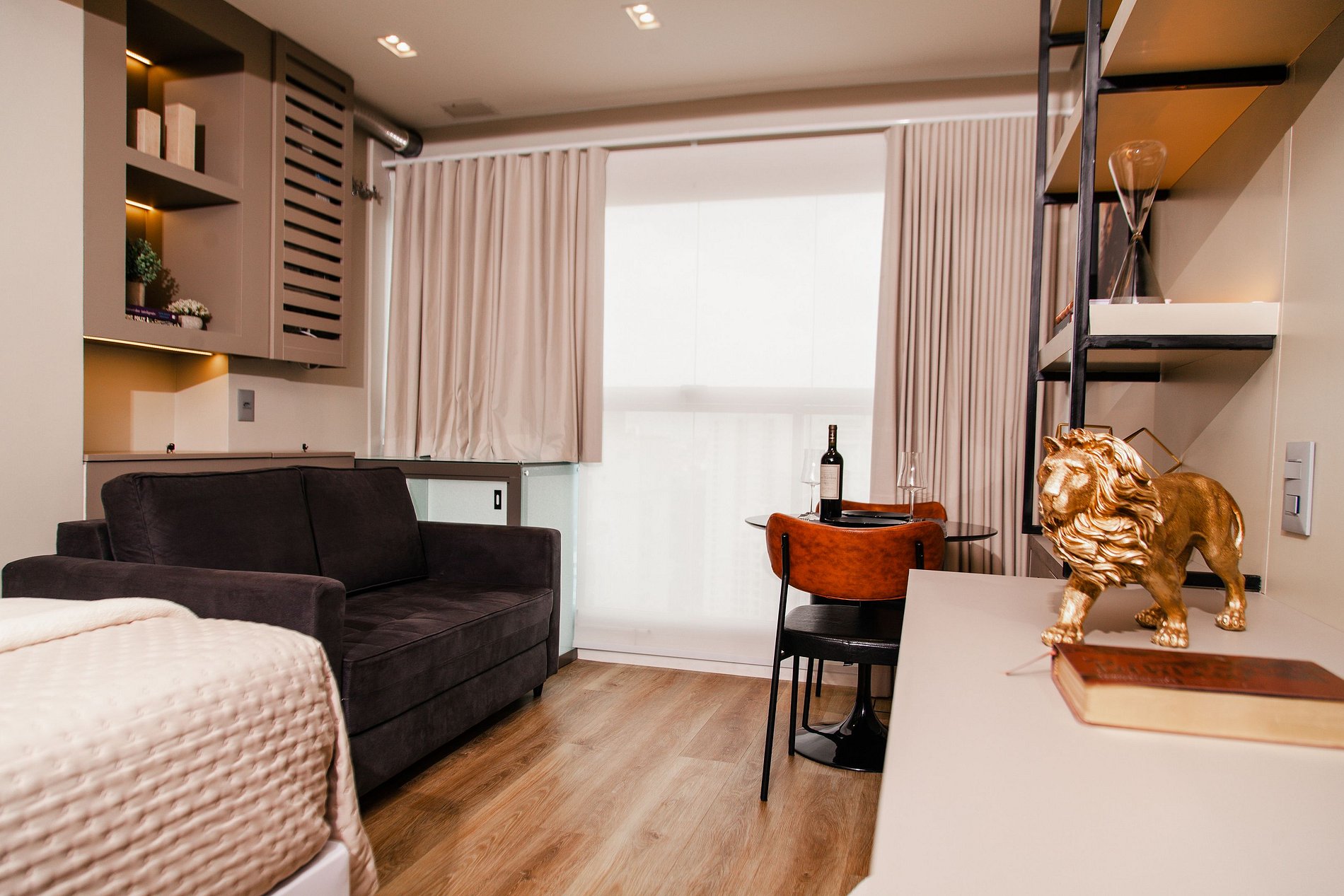 Amplo apartamento/studio com 30m² privativos, decoração e itens de alto padrão. Internet de alta velocidade com bancada para trabalho, TV Smart, cozinha completa mobiliada e aparelhada para pequenos lanches ou pequenas refeições e todos os utensílios e eletrodomésticos, mesa de jantar, sacada integrada com blackout, um banheiro. Com roupa de cama/banho inclusos, check-in/out 24hs.