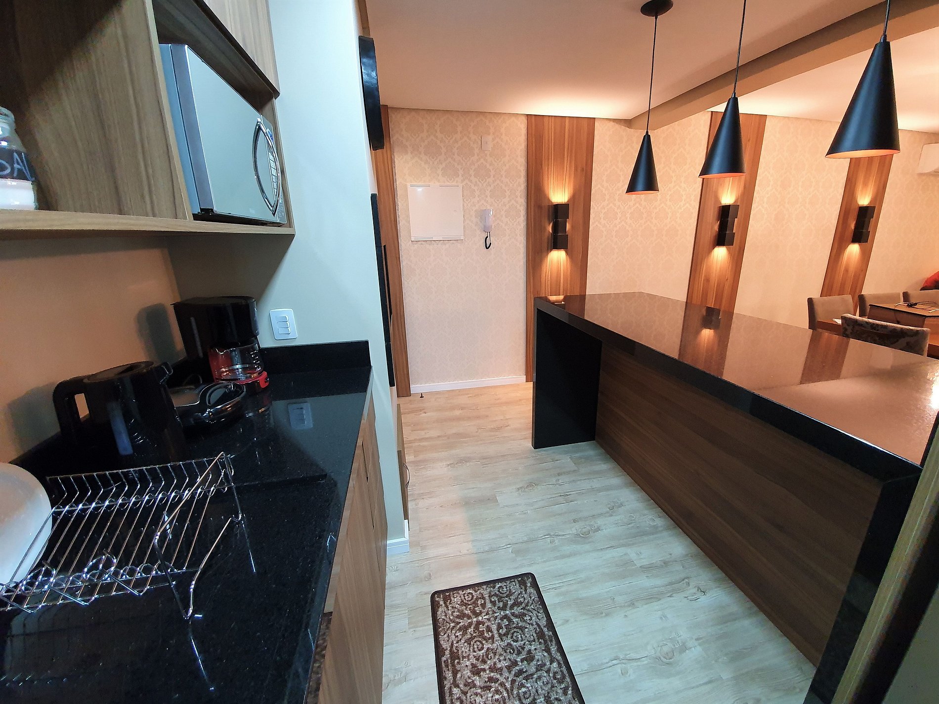 Cozinha totalmente equipada para refeições rápidas ou refeições completas. Inclui: geladeira, fogão embutido, micro-ondas, cafeteira, sanduicheira, chaleira, todos os utensílios de cozinha (copos, canecas, facas, taças, talheres, panelas, liquidificador, frigideiras etc.).
